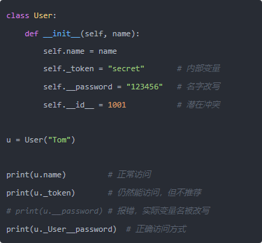 你会发现 _token 还是能访问,说明单下划线只是约定俗成。而 __password 被改成 _User__password,这就是 name mangling 的效果。至于 __id__,虽然现在没问题,但它可能会和未来的 Python 特性冲突。