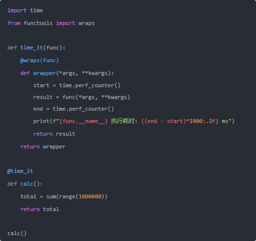 装饰器其实就是在函数执行前后插入逻辑,非常适合这种性能监控场景。