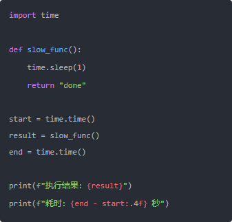 time.perf_counter() 比 time.time() 更精准,适合微秒级别的性能分析。