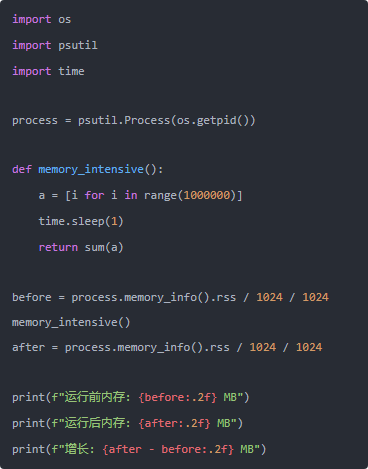 这样就能在任何代码块前后加个 with Monitor():,自动打印内存变化和耗时了。