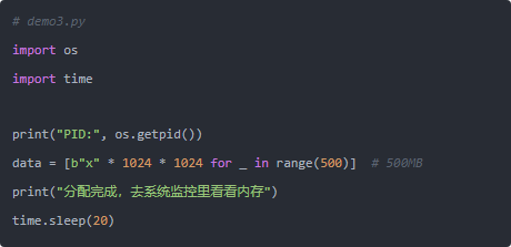 运行它的时候,你会看到 Python 占了 500MB。20 秒后程序退出,再去系统监控里看,内存立刻掉回去了。这就是操作系统的作用。
