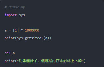 如果你盯着内存监控,会发现删除列表以后,进程的内存占用可能不会马上掉下来。这不是“内存泄漏”,而是 Python 自己把内存留在池子里,以备下次再用。