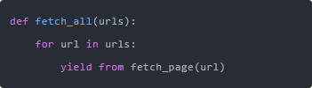 这句 yield from 等价于把 fetch_page 里的所有 yield 都打平出来,既省代码又逻辑顺滑。也是 Python 3 之后才支持的一个小亮点。