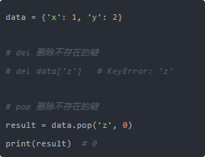 另一个问题是:如果你在遍历字典时使用 del 或 pop 会怎样? 在循环中直接修改字典会导致 RuntimeError,因为字典在被迭代时结构不能变化。这种情况下需要先取出键列表再删除: