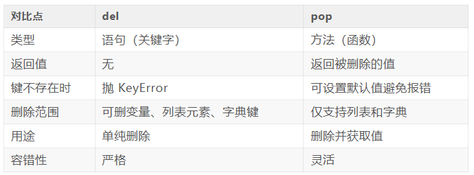 pop 则是字典(或者列表)自带的方法,它是函数式调用,有返回值。执行 pop(key) 时,它会从字典中删除该键,同时返回被删除的值。这点是最核心的区别之一。