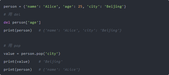换句话说,del 是语言语法层面的操作,pop 是字典对象行为层面的操作。 这也解释了为什么 del 不仅能用在字典上,还能删变量、列表项、甚至整个对象: