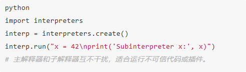 2. 子解释器:每个任务一个“小宇宙”Python 现在支持创建多个“子解释器”,每个解释器都有自己的变量空间,互不干扰。适合做插件系统、沙箱执行、并发任务隔离。