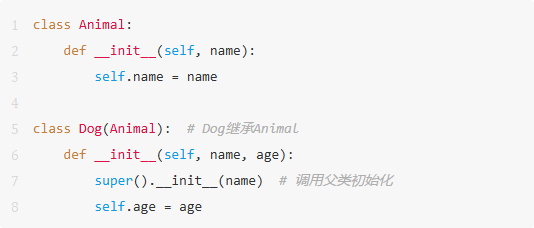 这样,Dog 就拥有了父类 Animal 的属性,还能拓展自己的新功能。 这就是继承的“魔力”——代码复用 + 功能扩展!