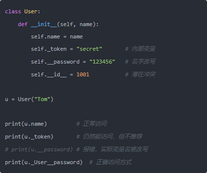 你会发现 _token 还是能访问,说明单下划线只是约定俗成。而 __password 被改成 _User__password,这就是 name mangling 的效果。至于 __id__,虽然现在没问题,但它可能会和未来的 Python 特性冲突。