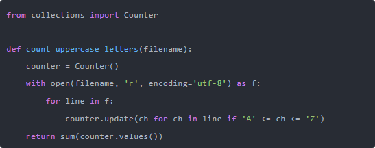 这版本其实就够用了,也挺“教科书式”的。 每一行读出来,再每个字符判断一遍,是不是大写。 最后返回统计结果。