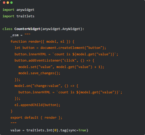 以下是一个简单的计数器widget的示例,展示了AnyWidget的易用性: