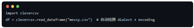 | clevercsv.read_dataframe | 直接读成 Pandas DataFrame | df = clevercsv.read_dataframe("a.csv") |