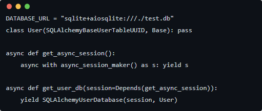 - • 创建 SQLAlchemyUserDatabase 依赖,注入到 FastAPI Users