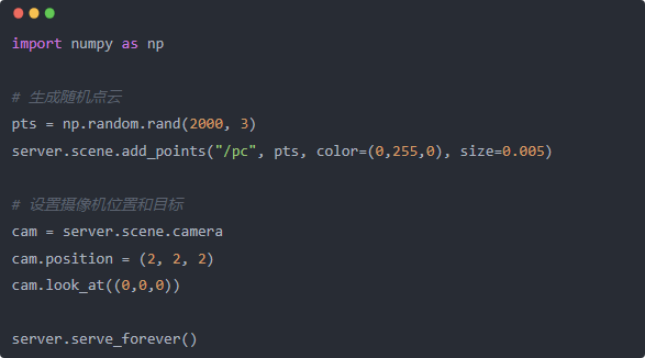 背后原理很简单:启动一个本地服务器,把 3D 场景用 WebGL 渲染到浏览器端,前后端实时同步。你只管写 Python,网页上就能看见、动起来。