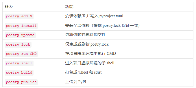 • 标准发布:poetry build + poetry publish,通用流程,少犯错。