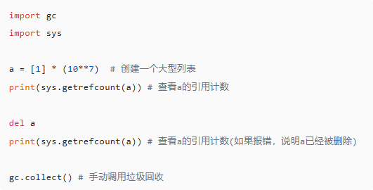 del语句: del语句可以用来删除一个变量的引用。当一个对象的引用计数器减为0时,该对象会被回收。这对于删除大型对象或不再需要的对象尤其有用,可以立即释放内存。