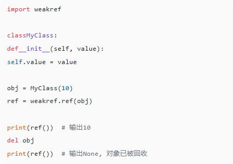 弱引用(weakref): 弱引用是一种特殊的引用,它不会增加对象的引用计数器。这意味着即使存在弱引用,当对象的引用计数器变为0时,该对象仍然会被回收。