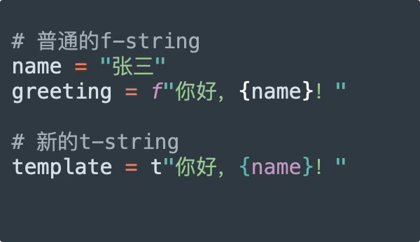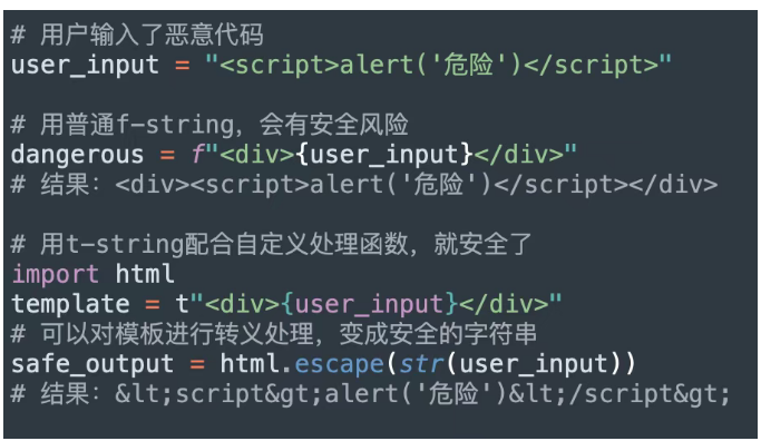 看起来差不多对吧?但t-string返回的不是最终的字符串,而是一个Template对象,包含了静态部分和动态部分的信息。我们可以对这个对象进行各种处理,比如HTML转义、SQL参数化等等,从根本上避免注入风险。