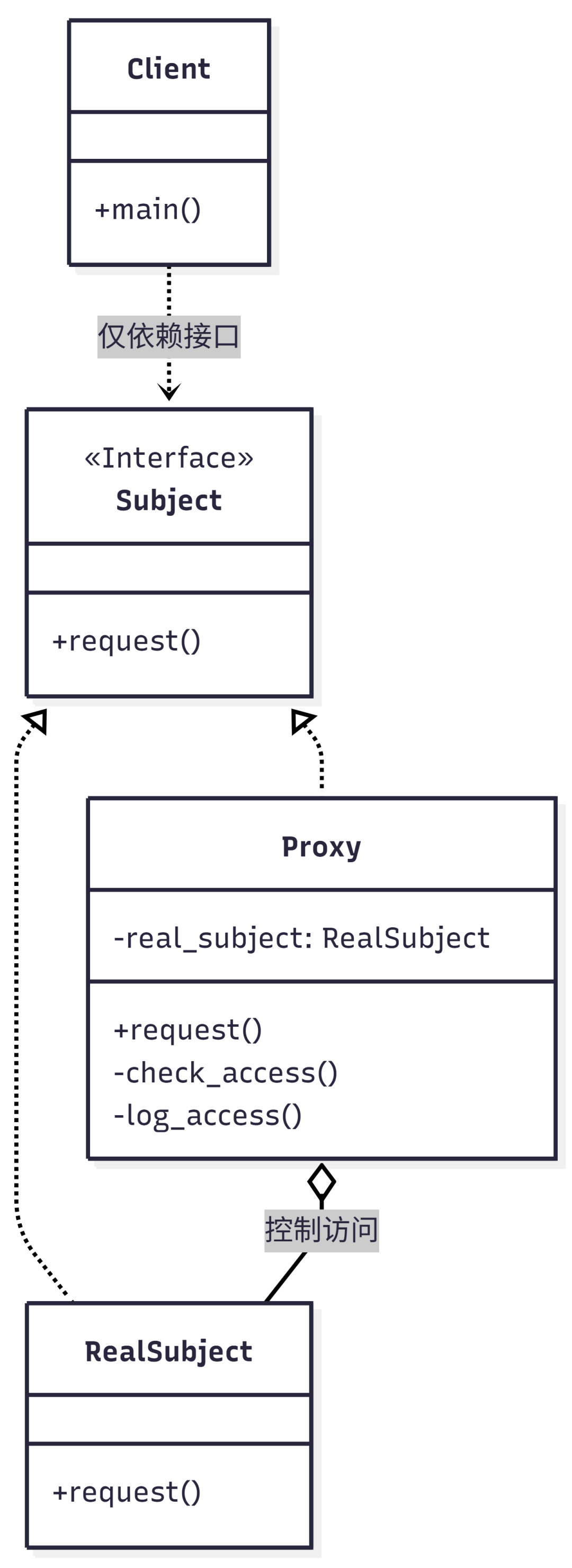 这时候,我们需要一个“中间人”。它长得和真实对象一模一样(接口相同),客户端根本分不清谁是真身、谁是替身。但这个替身,却悄悄地在幕后掌控了一切。