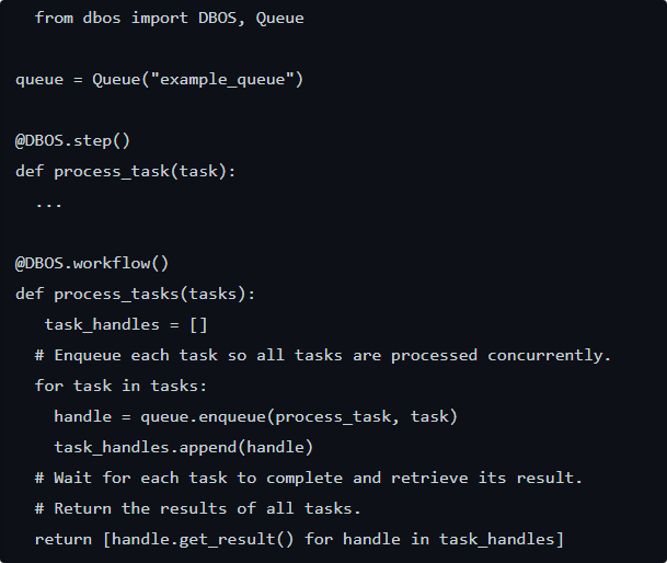DBOS 队列可帮助我们在后台持久运行任务,类似于 Celery,但更注重持久性和故障恢复能力,可以将持久工作流中的任务(可以是单个步骤或整个工作流)加入队列,然后我们的某个进程将拾取该任务执行,DBOS 负责管理任务的执行:它保证任务完成,并且即使应用程序中断,调用者也能获得结果而无需重新提交。