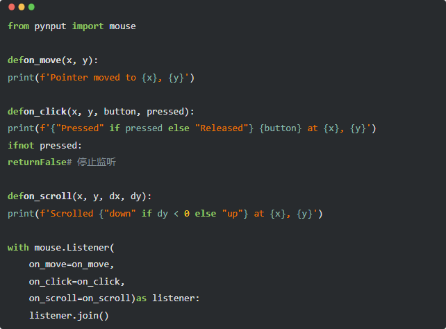 鼠标监控: pynput.mouse.Listener类则允许你监听鼠标事件,例如鼠标移动、点击和滚动。你可以自定义回调函数来处理不同的事件。