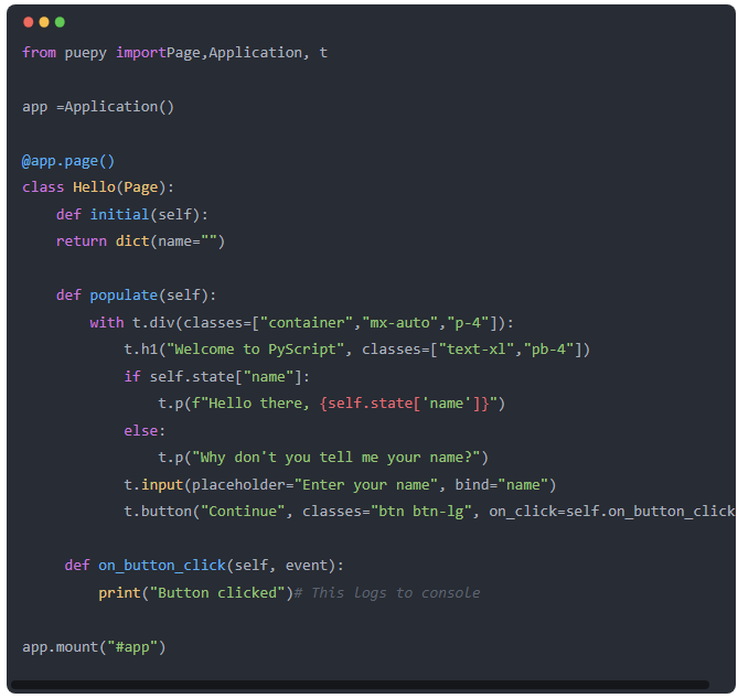 在这个示例中,我们定义了一个简单的页面类“Hello”,它带有一个输入框和一个按钮。用户输入他们的名字后,页面会自动显示欢迎信息。这个简单的示例展示了PuePy如何通过简洁的语法实现复杂的功能。