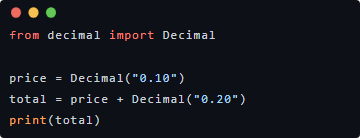 Python 内置的 decimal.Decimal 类型专为精确的小数运算而设计。它将数字存储为实际的小数分数,而不是二进制近似值。
