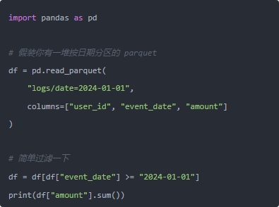 而且列式存储还有一个经常被忽略的点:过滤可以在 IO 层做掉一大半。有些引擎(像 DuckDB、Polars、Spark 那一票)读 Parquet 的时候,会先把“某一列的统计信息”扫一下,比如这一块数据里 event_date 最小是 2023-01-01,最大是 2023-01-31,你的条件是 >= 2024-01-01,那这整块数据它连读都不读,直接跳过。 你想象一下,你查一个 10 亿行的表,结果磁盘只读了其中 5%,后面那 95% 连看都没看,这个性能…就不多说了。