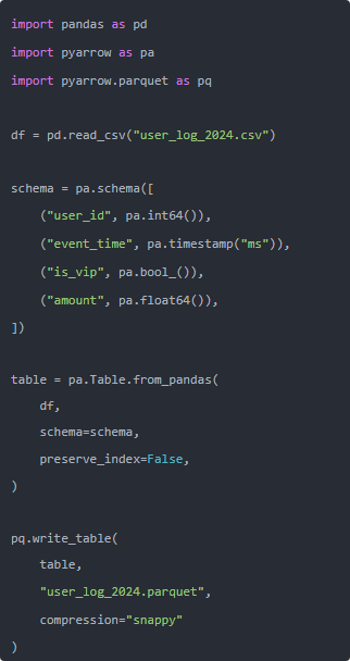 Parquet 不一样,它自带 schema。你写的时候就把类型钉死,下游谁读,都得按这个类型来,不许瞎猜。我要稍微严谨一点的时候,会这么搞: