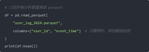 你想象一下一个 1 亿行的埋点表,你只是想看一下 user_id + event_time, CSV 的玩法是:整行读进来,然后扔掉你不要的列。 Parquet 的玩法是:磁盘上本来就是按“列”存好的,它直接只把这两列从盘里抠出来,IO 直接打骨折。