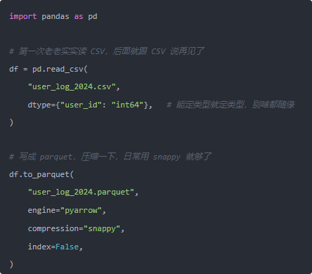 行了,差不多就说到这,我这边会议提醒已经响了三遍了…… 你要是现在手里有个大 CSV,在服务器上读着卡得要死,要不先照着上面那几段代码,悄悄转一个 parquet 试试? 等你跑完再来跟我说一句:东哥,这玩意儿,真香。