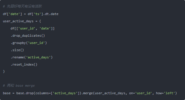 第三,那个 active_days 其实可以提前算好,不用在 agg 里再来个 lambda: