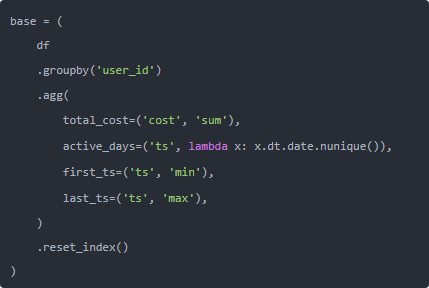 业务小哥的需求也很朴素: 每个用户统计一下各种事件次数、总金额、首末时间,顺带算个留存啥的。听起来就像“很适合用 groupby 啊,对吧”,于是年轻时候的我就写出了下面这坨——典型的“学会了一个 groupby,然后用到死”的代码: