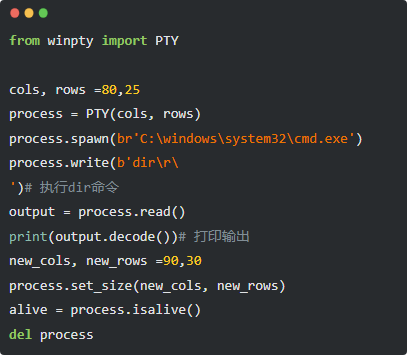 这段代码首先创建一个PTY对象,指定终端大小。然后,它使用spawn方法启动一个CMD进程,并写入dir命令。最后,它读取输出并打印,以及调整终端大小,最后释放资源。