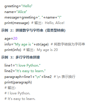 效率问题:频繁使用 + 拼接大量字符串可能效率较低(每次拼接都会创建新对象),建议使用 str.join() 方法或 f-strings 优化。