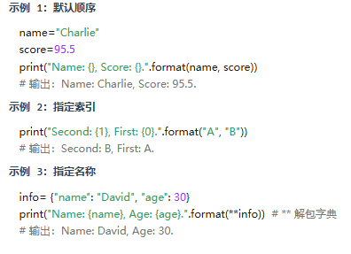 语法:"格式字符串".format(值1, 值2, ...)占位符:{}(默认顺序)、{0}(指定索引)、{name}(指定名称)。