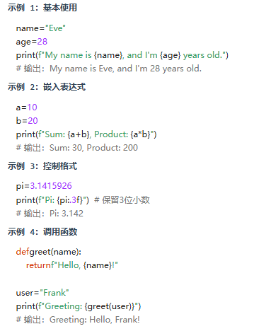 语法:f"格式字符串"(在字符串前加 f,变量直接写在 {} 中) 特点:语法简洁,支持表达式和函数调用,是 Python 3.6+ 的推荐用法。