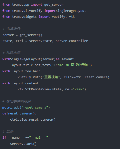 就这么几行,浏览器里立刻出现交互式 3D 窗口,按钮点击、状态同步都不需要写额外 Web 逻辑。