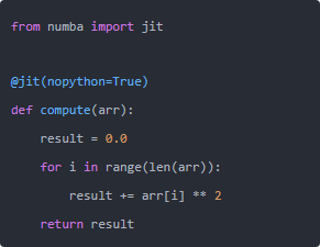 注意:nopython=True会强制Numba使用纯机器码模式,不回退到Python解释器,性能最好,但对代码有一些约束(比如不能使用任意Python对象)。