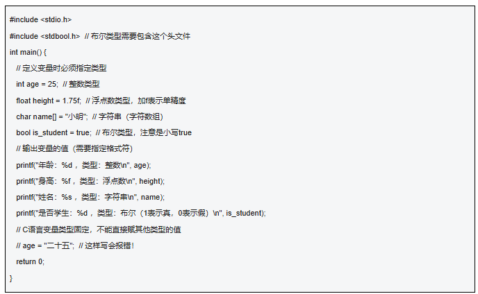 7. 布尔类型:Python用True/False(首字母大写);C语言(C99标准后)用true/false(小写),且输出时用%d显示为1/0,没有专门的格式符。