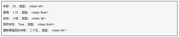 4. Python变量支持“动态类型”,即同一个变量可以重新赋值不同类型的数据,比如age一开始是整数,后来变成了字符串,这在很多语言中是不允许的。