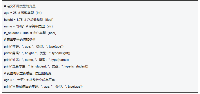 1. 变量定义格式:变量名 = 值,=在这里是“赋值”的意思,把右边的值“放进”左边的变量里。比如age = 25,就是给“25”这个整数起了个名字叫age。