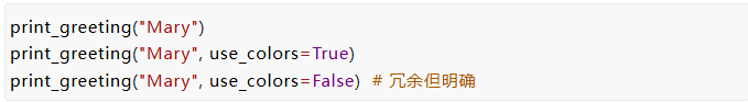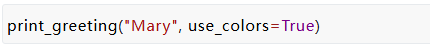 一旦我们有了这些Keyword-only限关键字的参数,我们还可以问“我们真的有好的默认值吗?” 假设我们意识到颜色代码的使用非常重要,并且每次使用 print_greeting 函数时都必须传递——我们没有一个好的默认值, 我们可以这样写我们的函数: