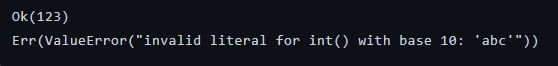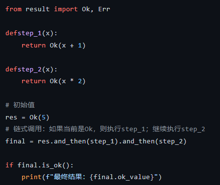 1. 1. 明确性:函数签名 def fn() -> Result[str, ValueError] 直接告诉调用者“我会成功返回字符串,或者失败返回ValueError”,这在静态类型检查(如mypy)下非常有用。
