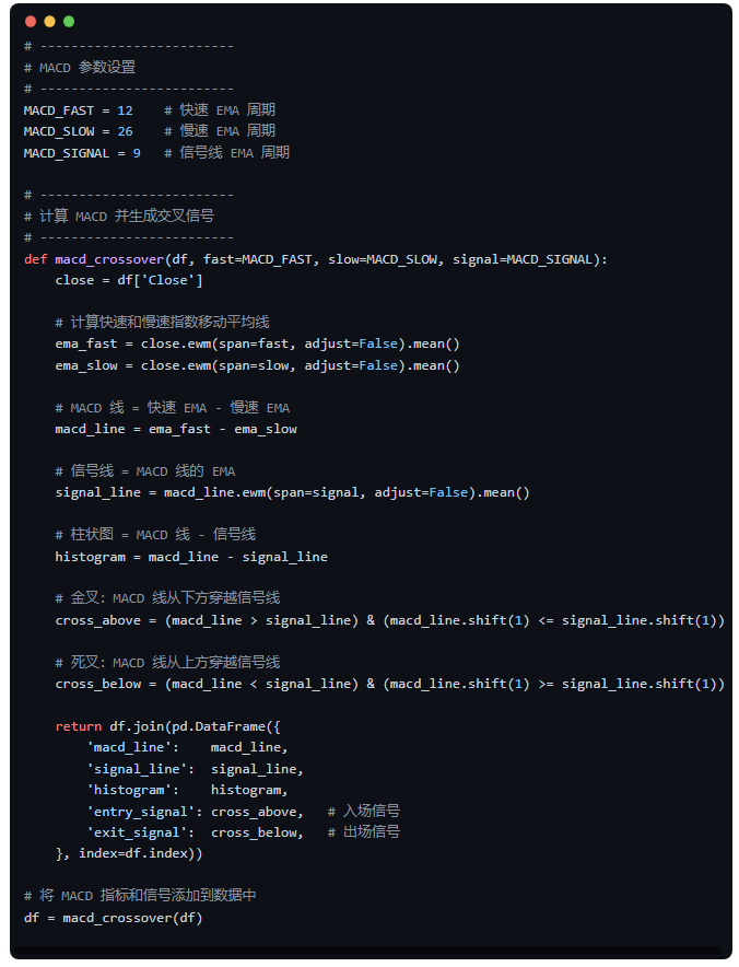 第二步:计算 MACD 并生成交易信号