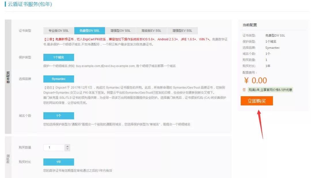 升级到 HTTPS 协议的第一步,就是要获得一张证书。阿里云上可以申请免费的HTTPS证书。