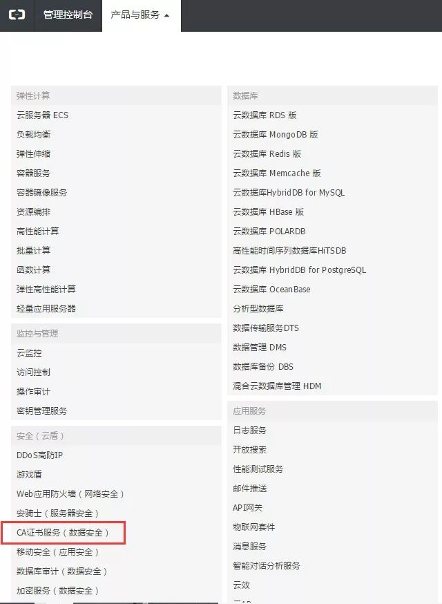 1.首先登录阿里云,在“产品与服务”的下拉菜单中,找到“CA证书服务(数据安全)”。